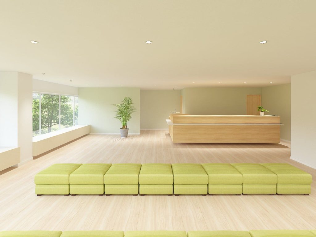 明るい木目とグリーンで清潔感を演出した、内科クリニックの受付・待合室デザイン カラー明るい木目黄緑特徴・イメージ・テイストナチュラル明るい清潔感その他キーワード内科内視鏡内科受付待合室消化器内科漢方内科糖尿病内科