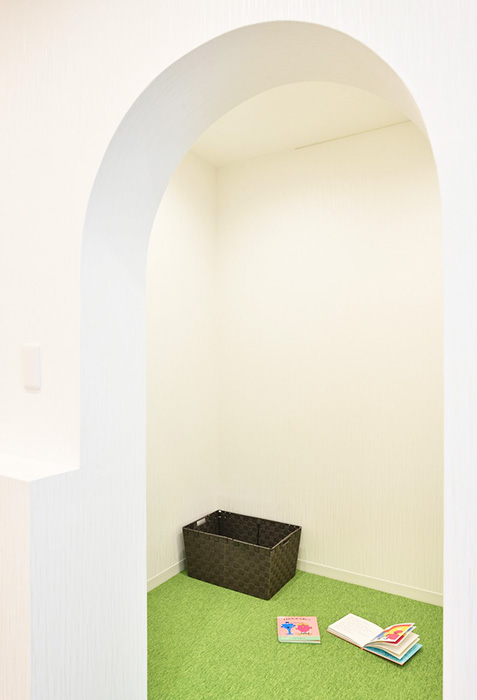 小児科を併設しているため、キッズスペースの入口には曲線を取り入れ、やわらかく親しみやすい印象になるよう仕上げています。