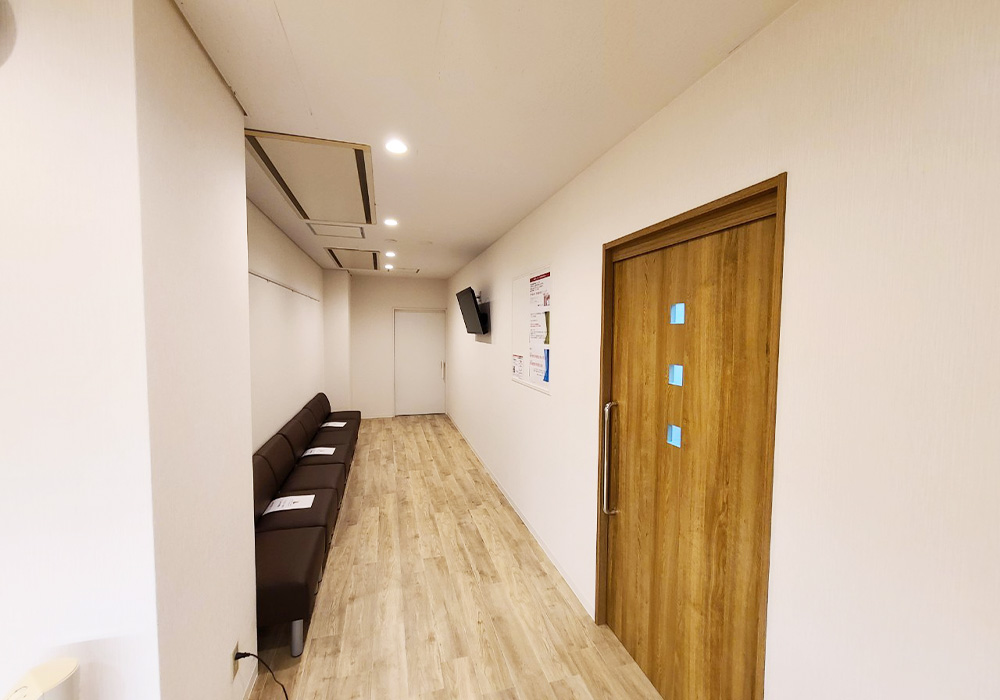 院内は木目の素材感を活かしつつ、壁や床、家具の色味を落ち着いたトーンで統一することで、洗練された雰囲気を演出しています。特に受付まわりは、ゆるやかな曲線を描くカウンターデザインと間接照明を組み合わせることで、やわらかさと高級感を両立した印象的な空間に仕上げました。
