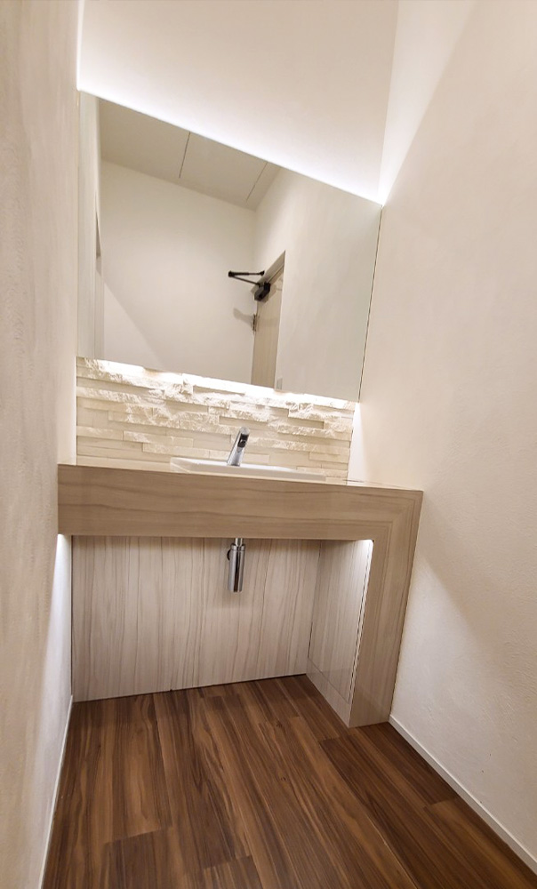 今回の事例では、素材の質感や色合い、そして照明の見せ方まで丁寧に整えることで、シックでありながら温かみも感じられる空間を目指しました。移転を機に、機能面だけでなく医院の印象そのものを高める内装に仕上げた事例です。